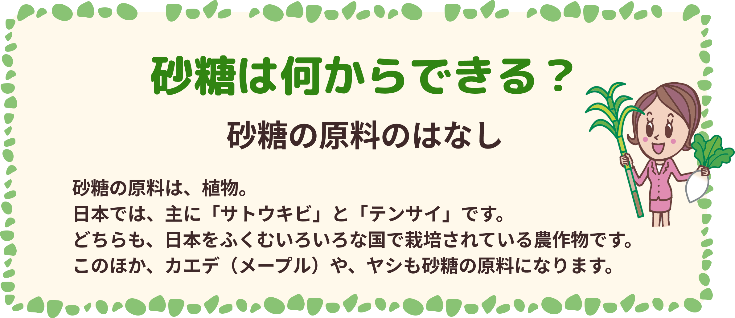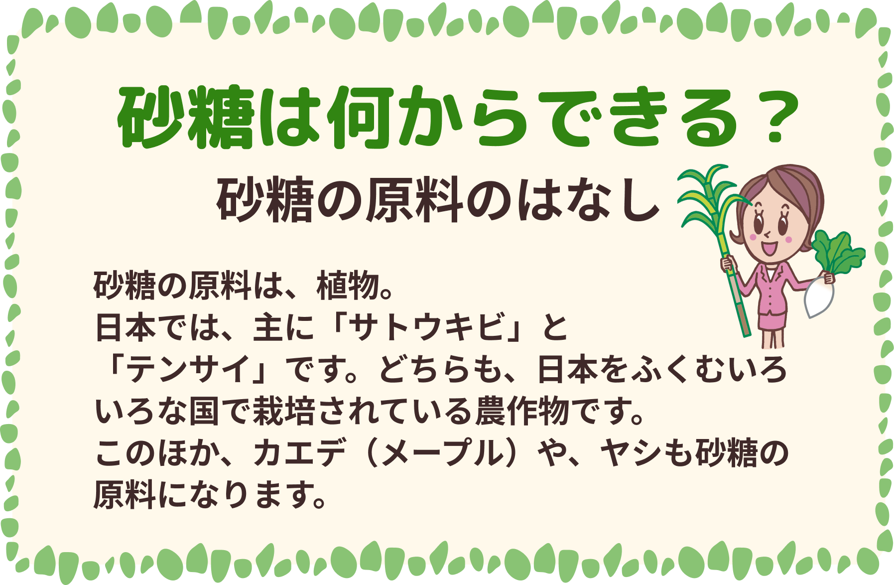 サトウキビはくきに、テンサイは根に砂糖をたくわえます。