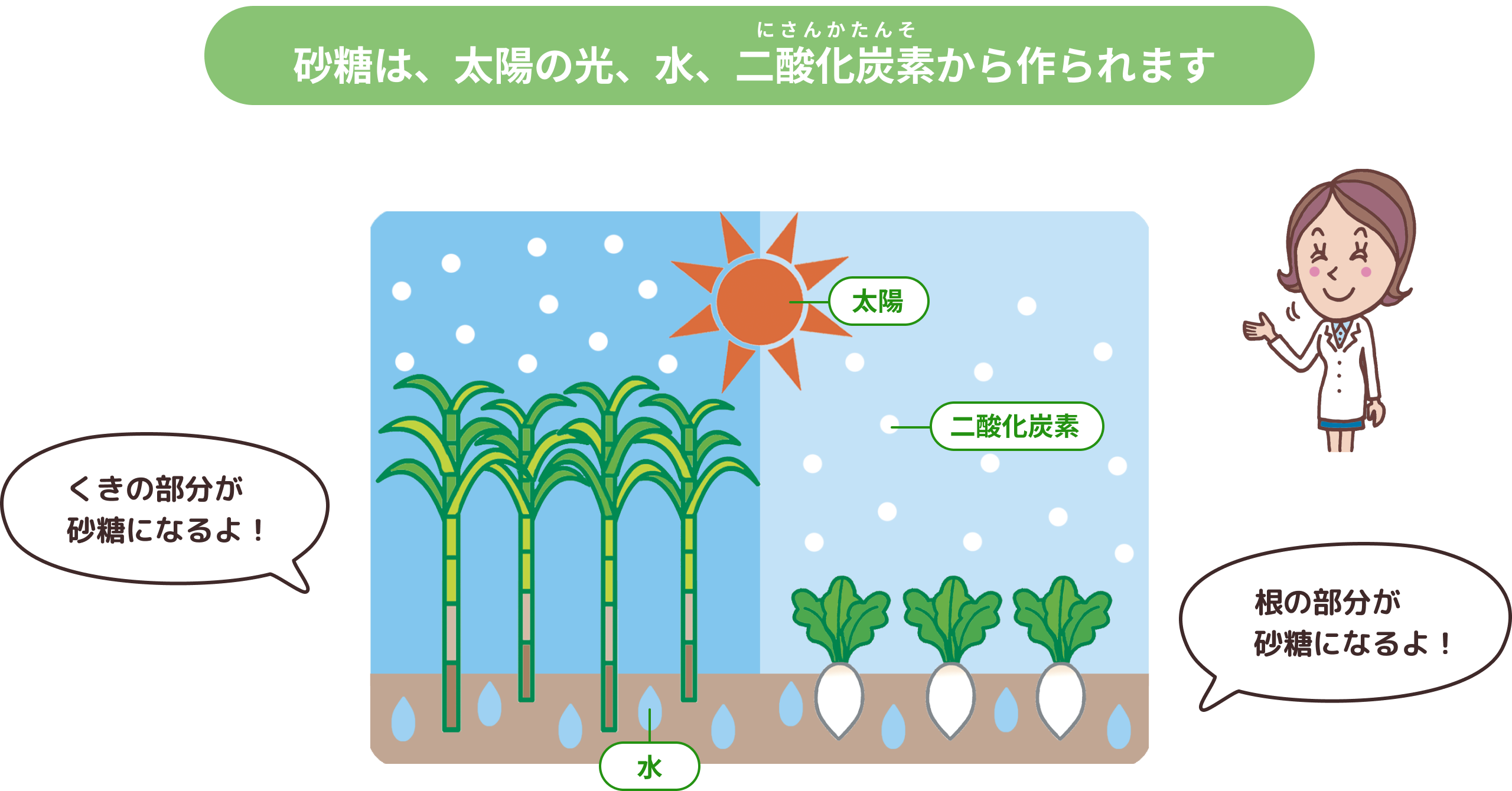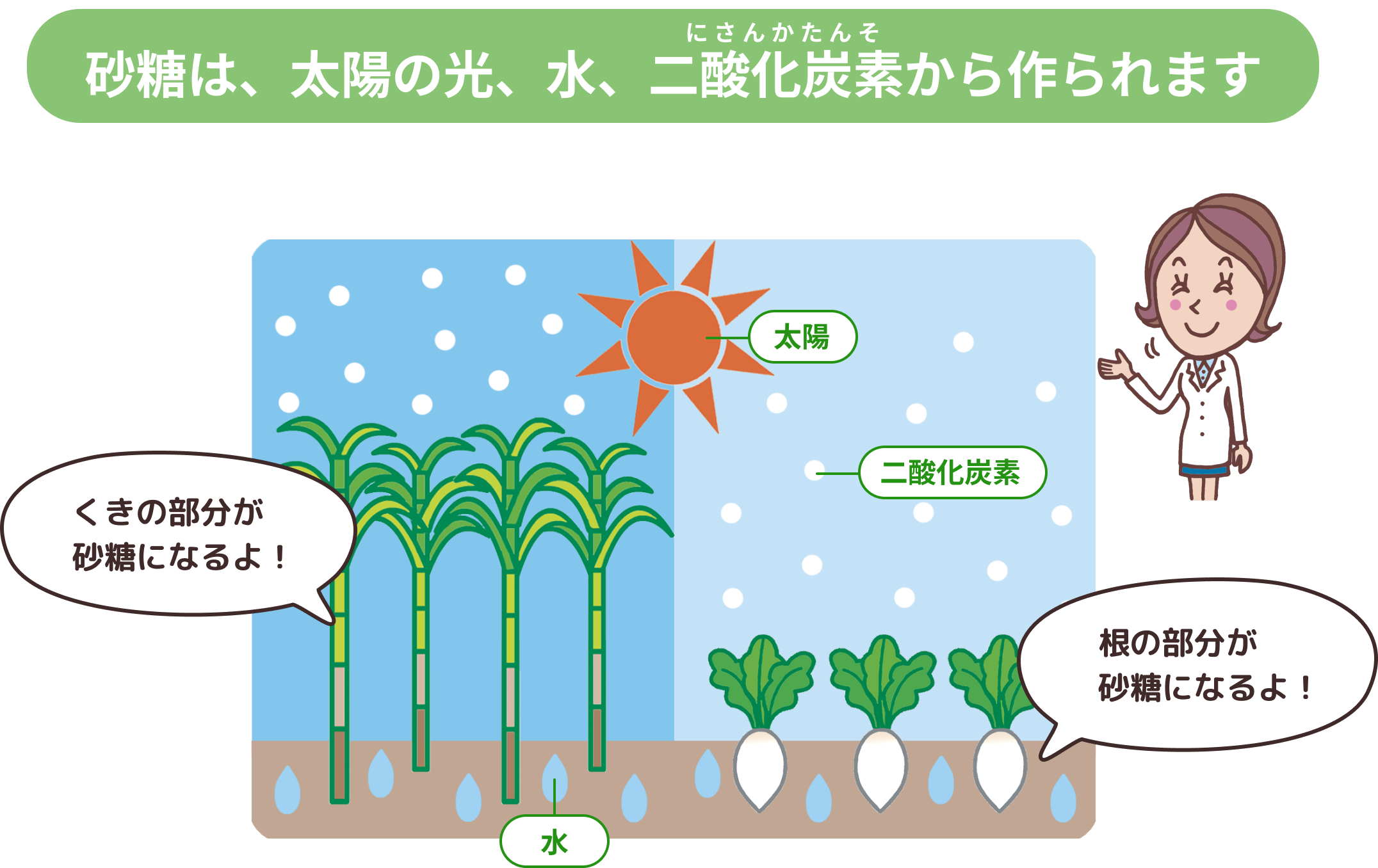 サトウキビやテンサイは、光合成でできた炭水化物を「砂糖」としてたくわえています。